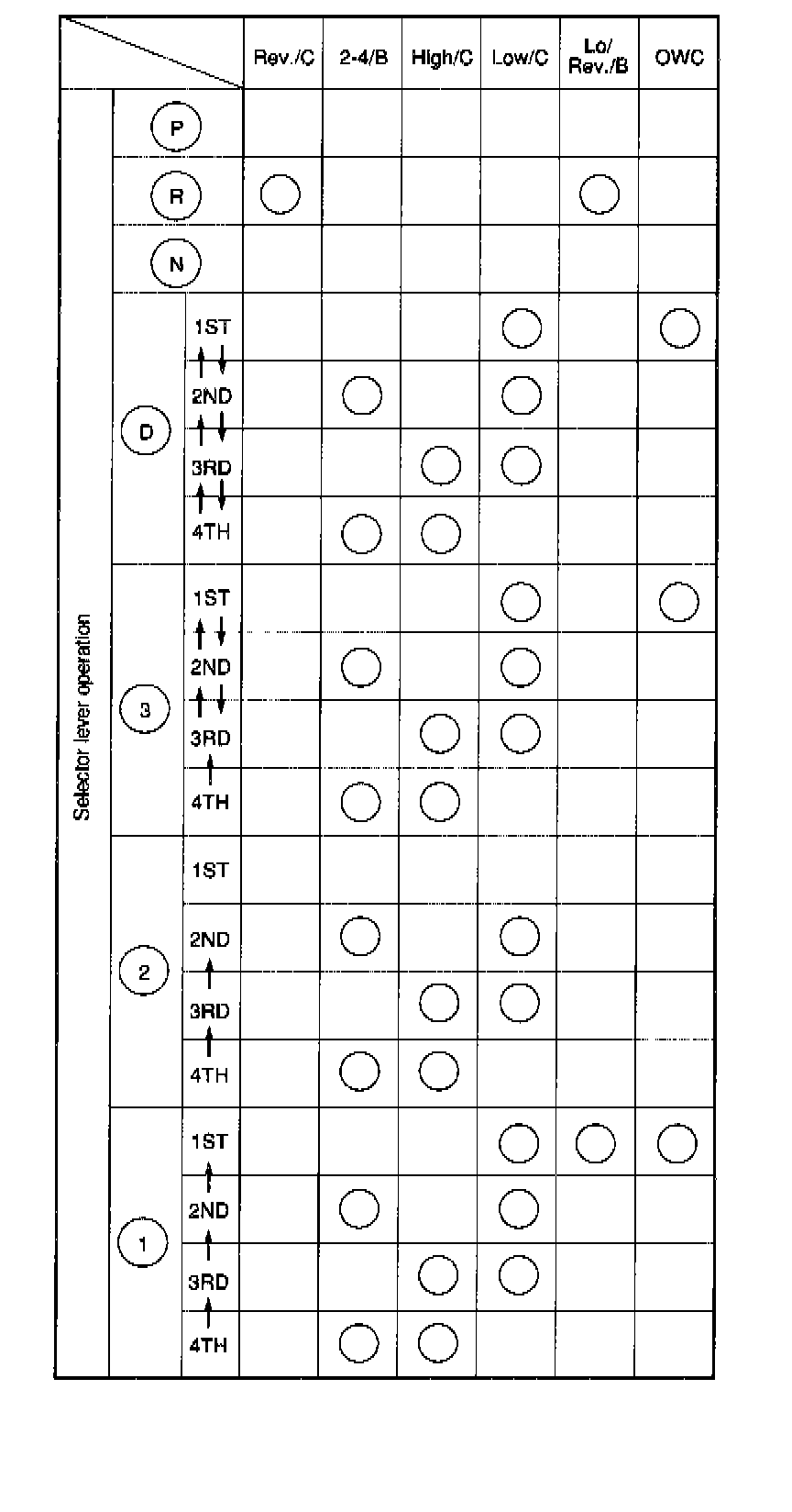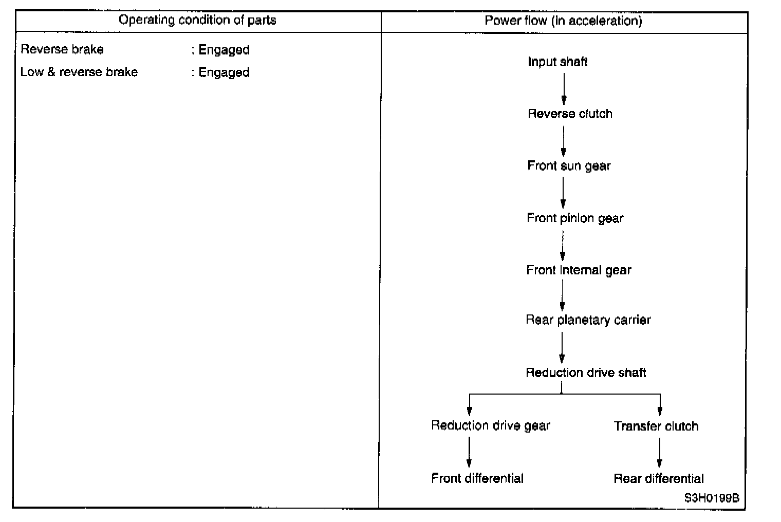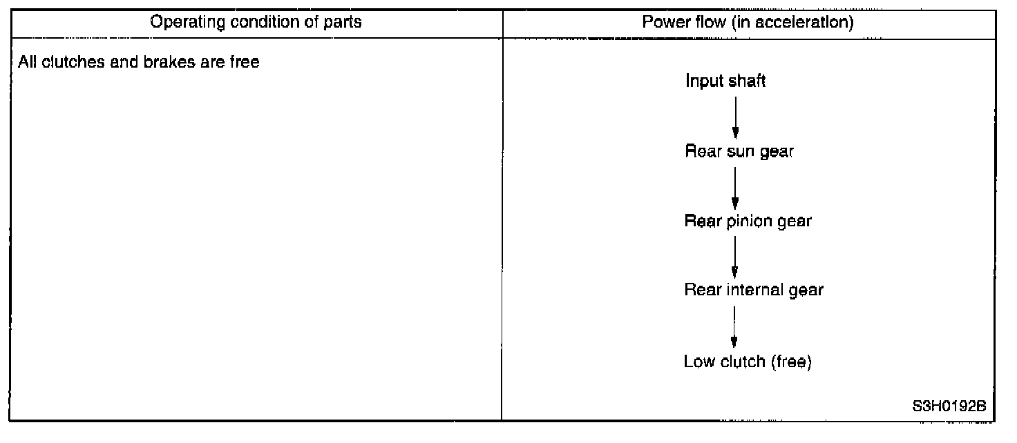 At 1st speed of this range, the low clutch and the low & reverse brake are thrown into engagement. The 1st speed in this range shows the same operation as the 1st speed in the D or 3 range. However, the one-way clutch produces no effect because the low & reverse brake is operated.