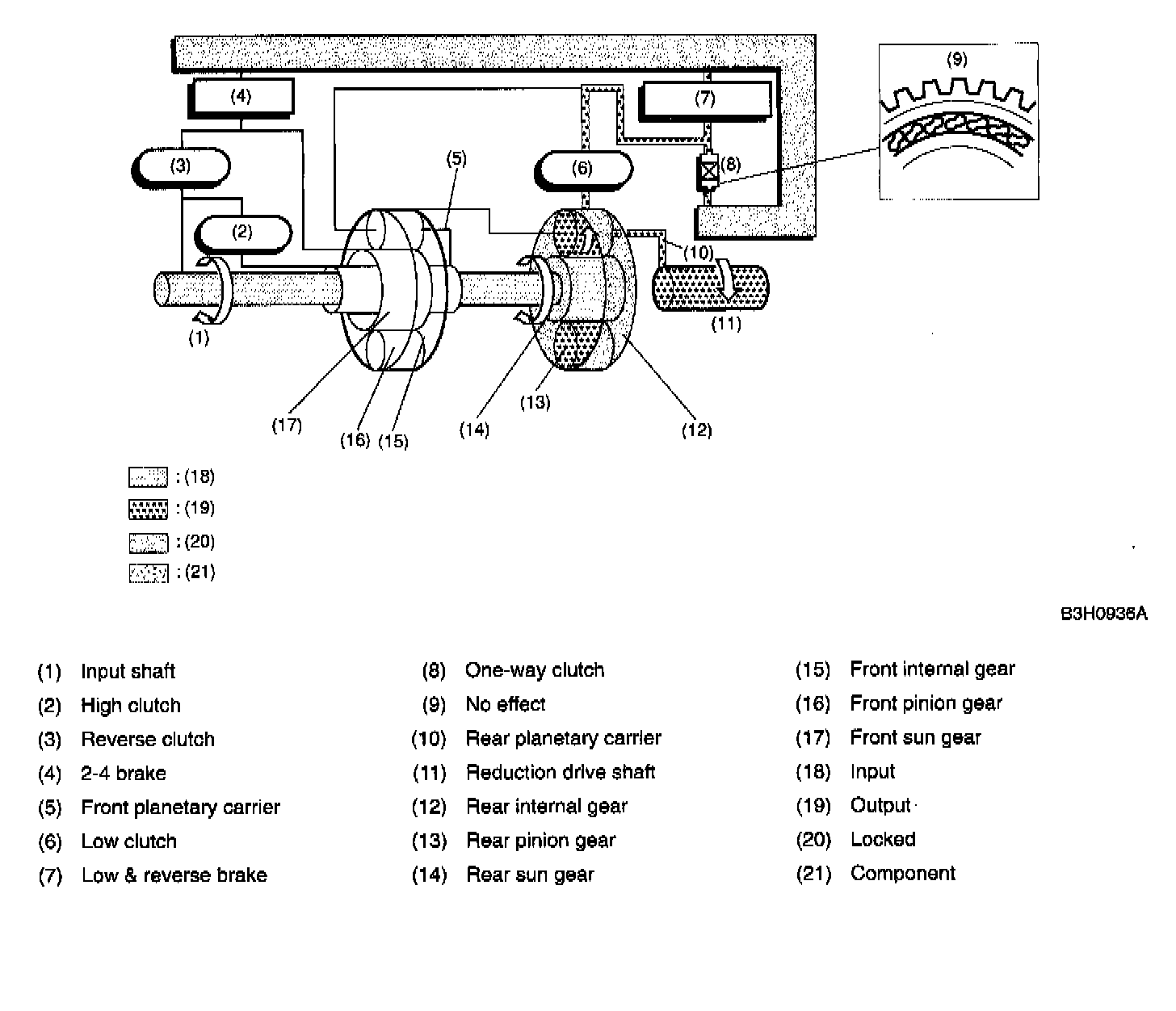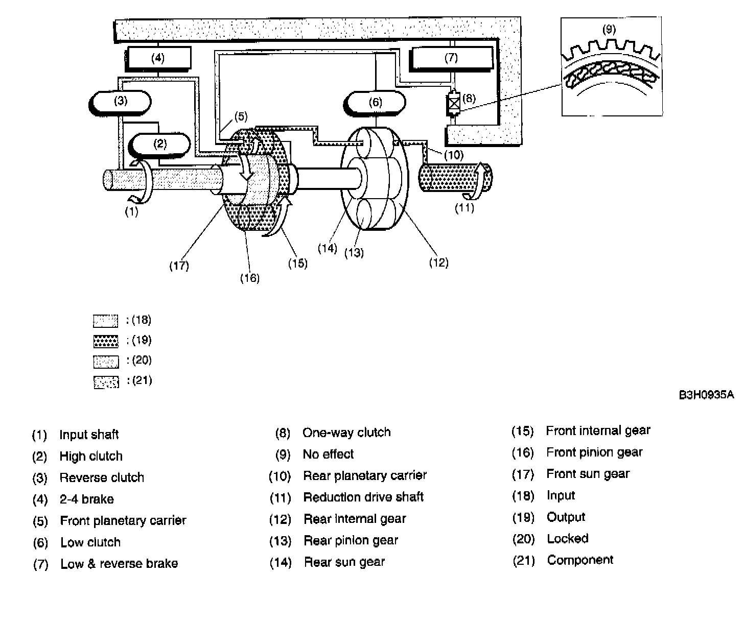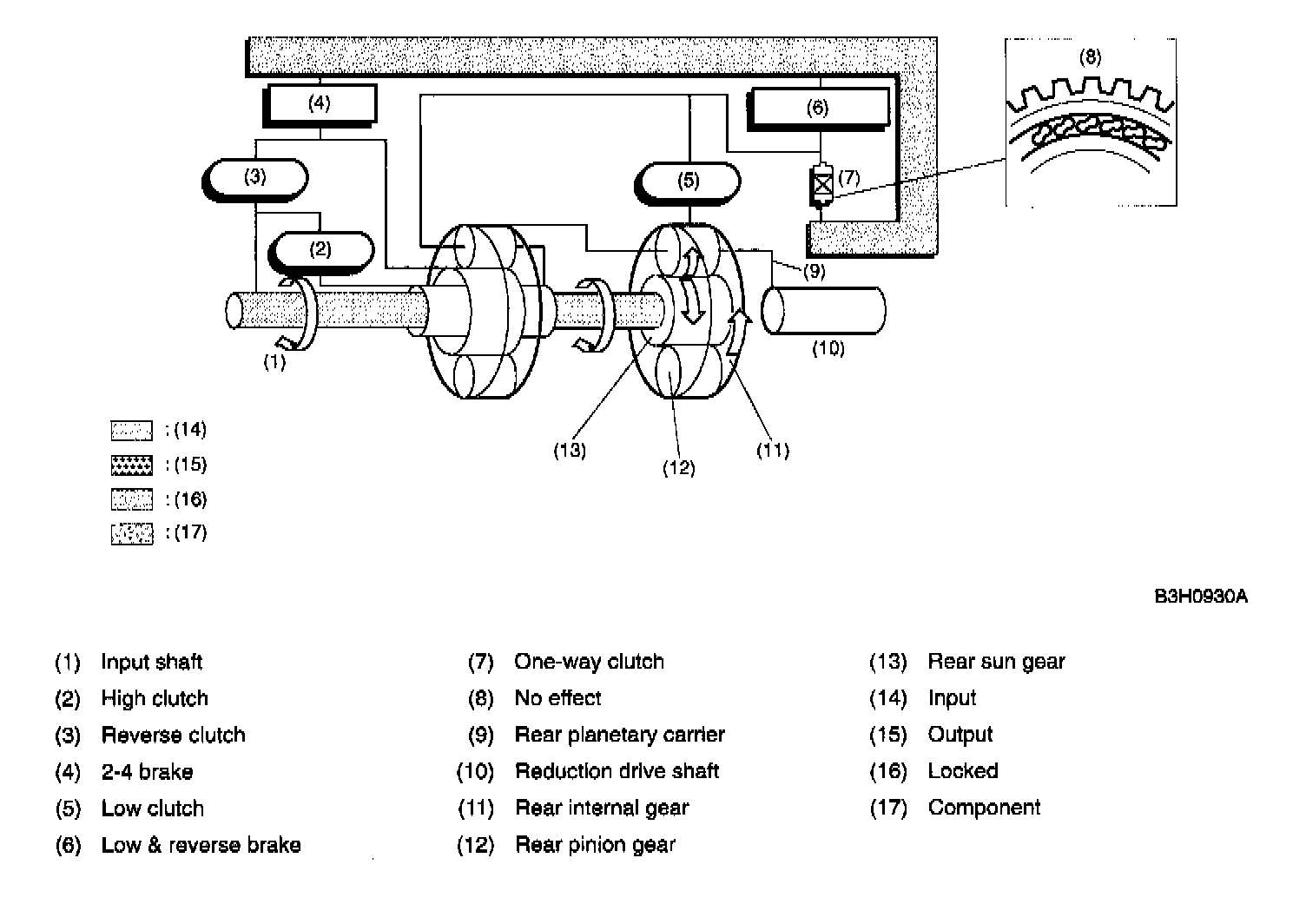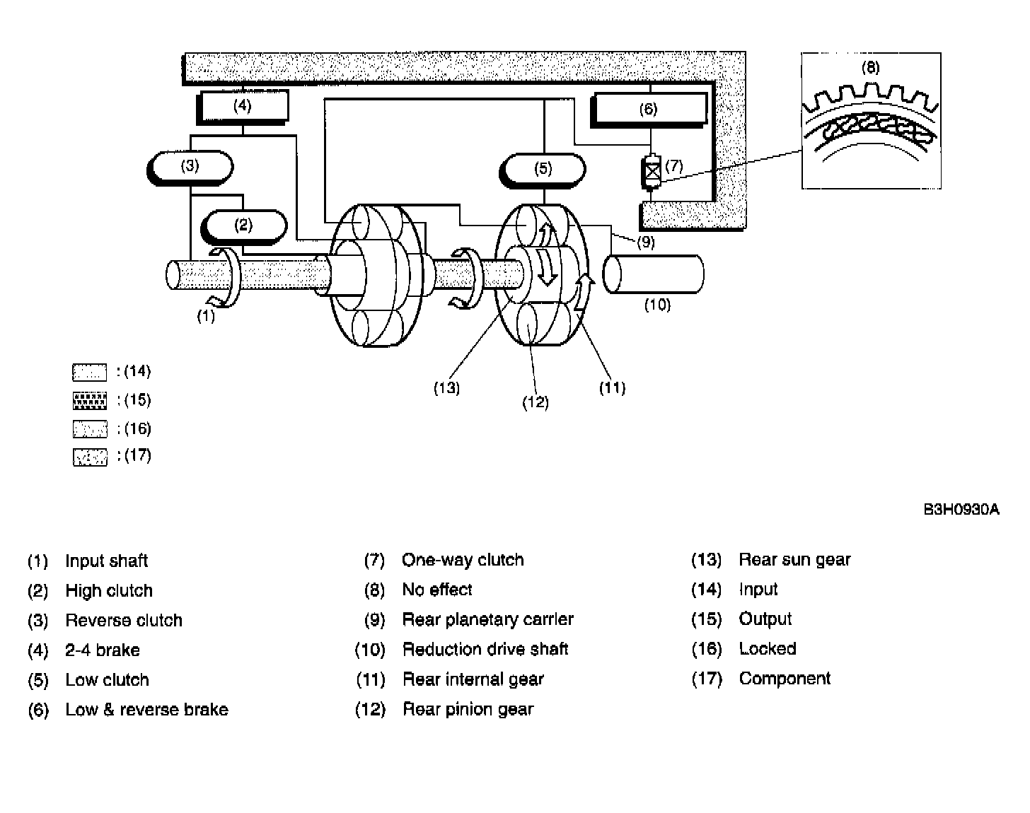 At 2nd speed, the driving power is transmitted without being affected by the one-way clutch. Therefore, the back driving force from the reduction drive shaft is transmitted to the input shaft, thus the engine braking effect being available.
