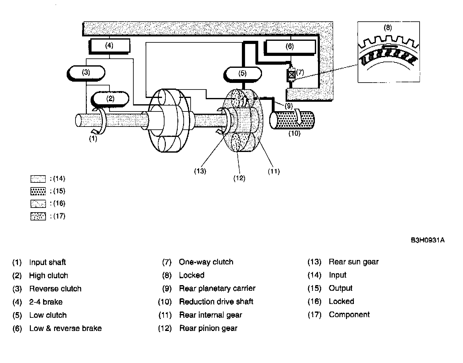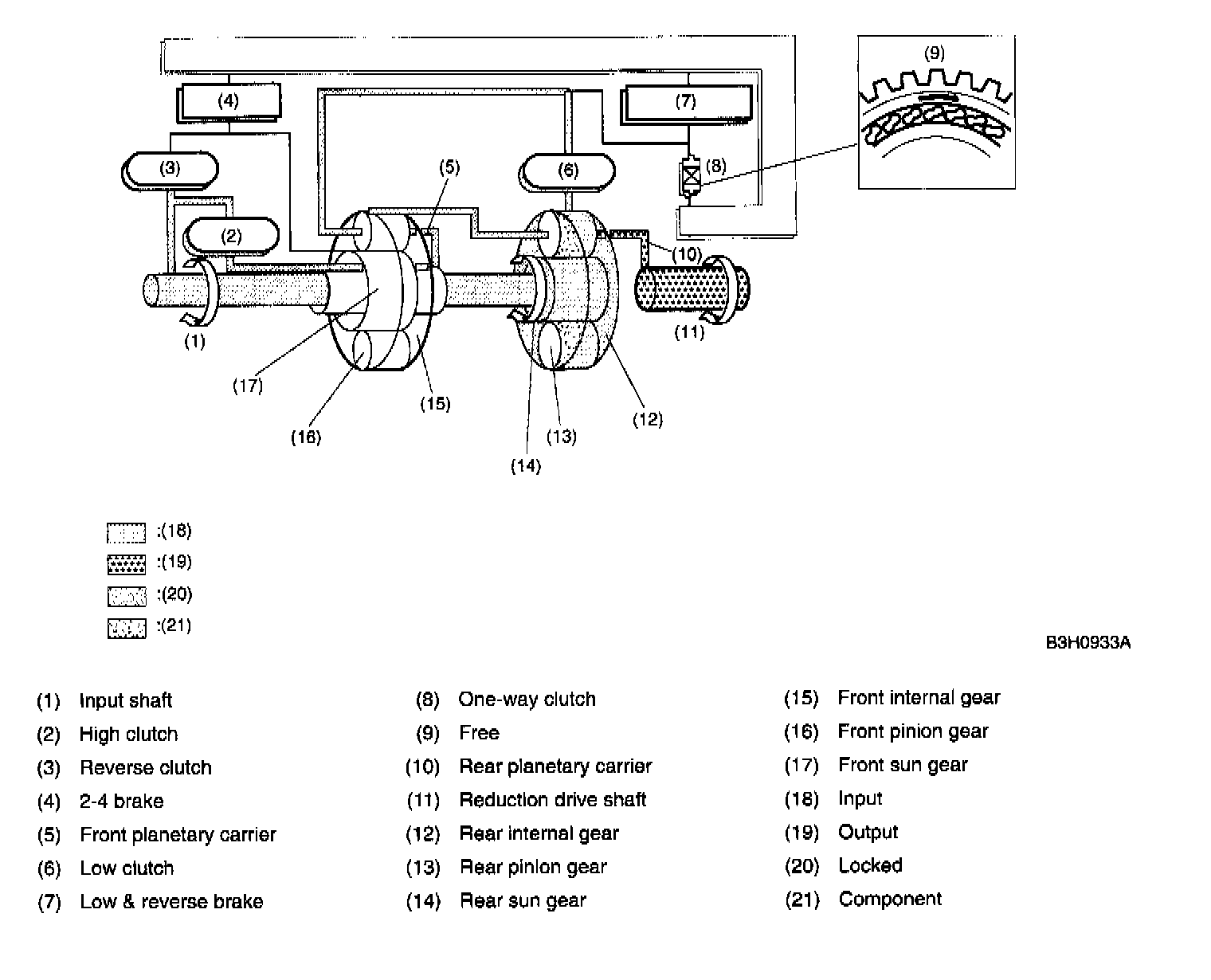 Since the rear sun gear and the high clutch drum are in mesh with the input shaft, they rotate together with input shaft.