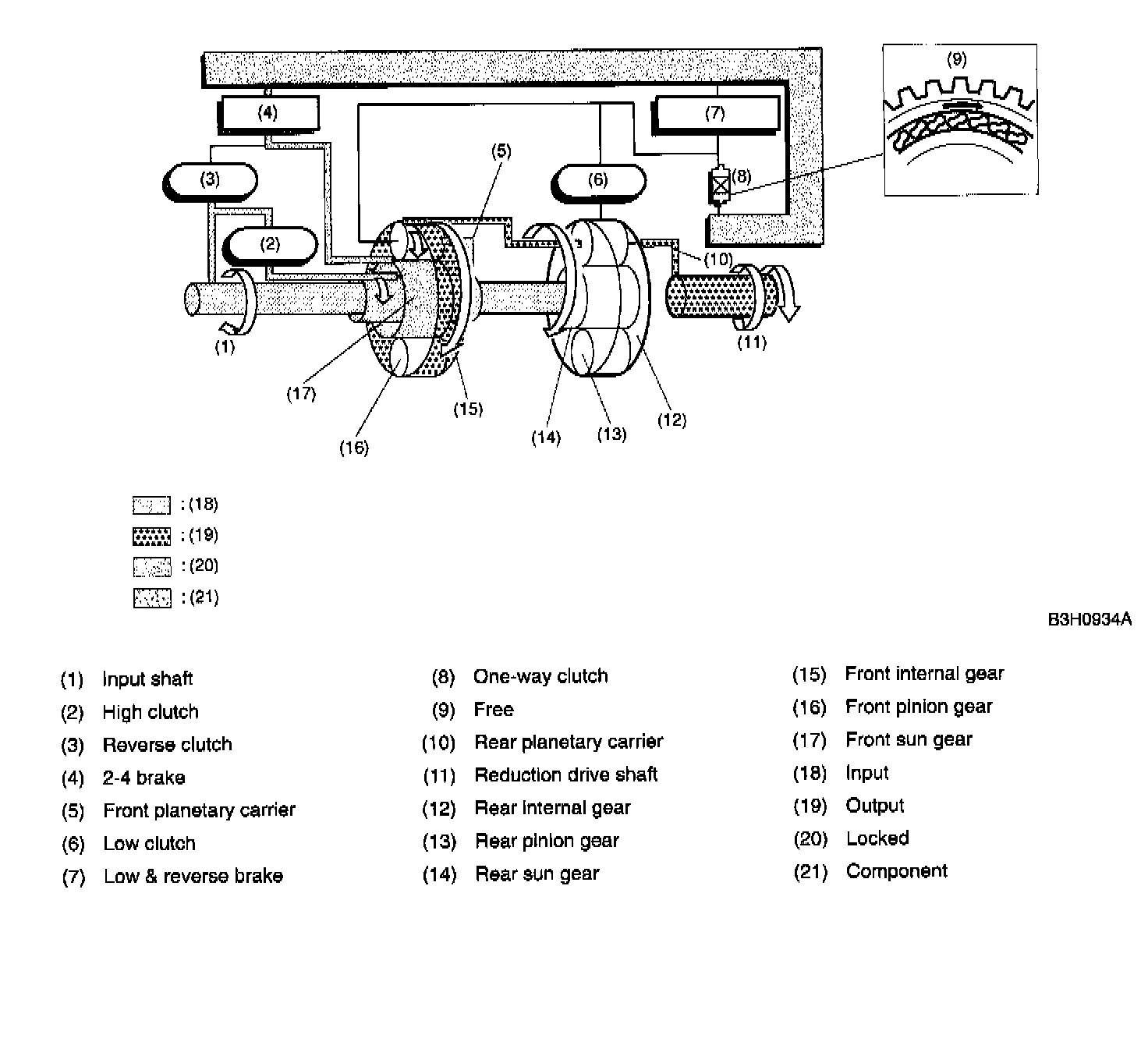 In "R" range, the reverse clutch and the low & reverse brake are thrown into engagement. The engaged reverse clutch allows the front sun gear to rotate, while the engaged low & reverse brake allows the low clutch drum to be interlocked with the transmission case.