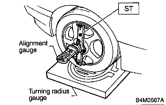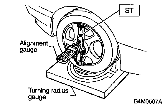 2. Set ST into the center of the wheel, and then install the wheel alignment gauge.