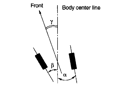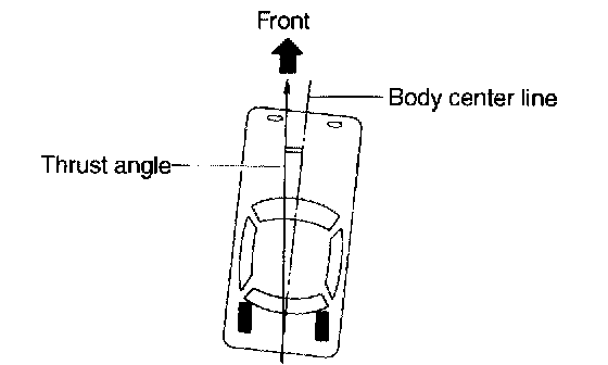 NOTE: Thrust angle refers to a mean value of left and right rear wheel toe angles in relation to vehicle body center line. Vehicle is driven straight in the thrust angle direction while swinging in the oblique direction depending on the degree of the mean thrust angle.
