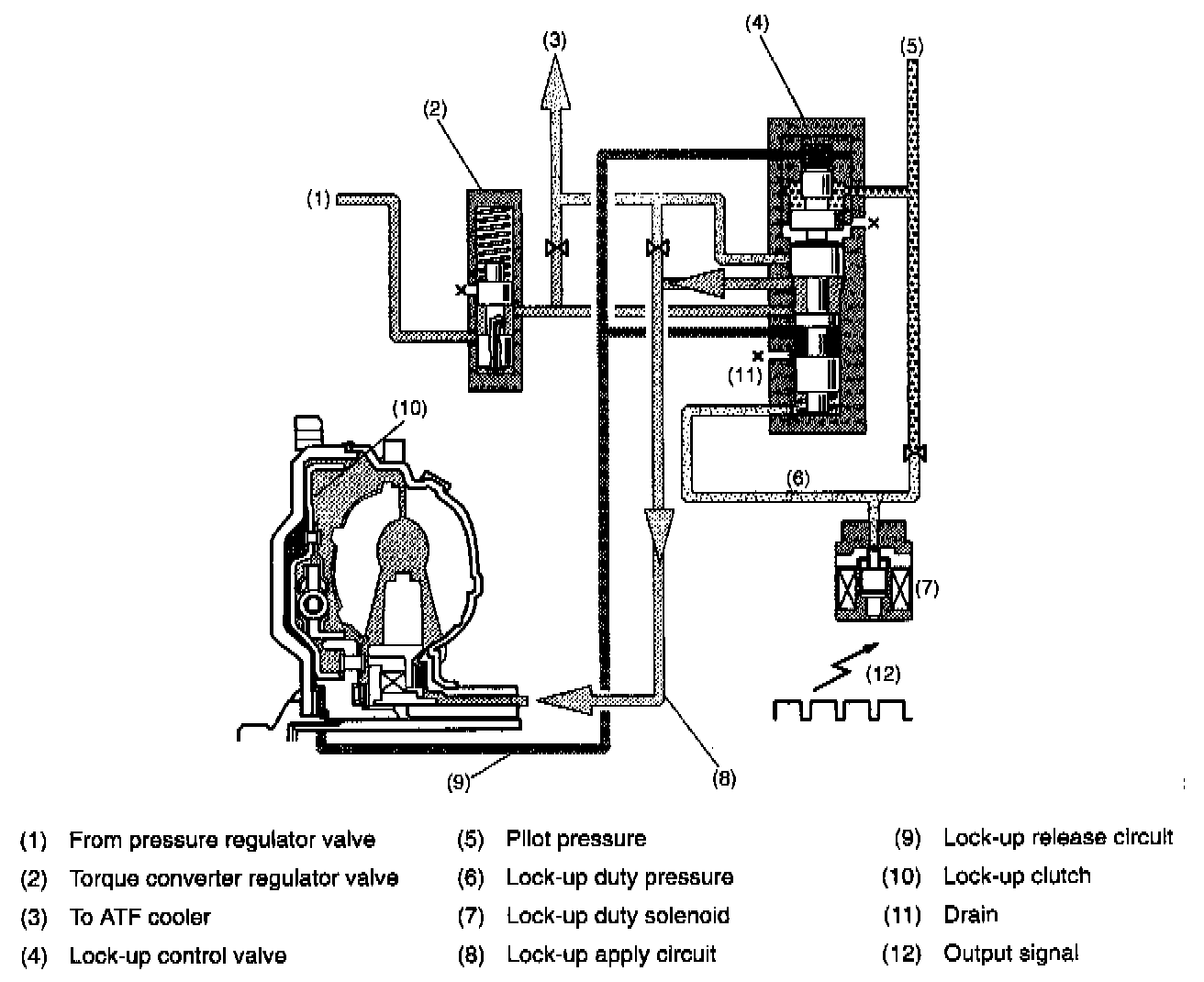 The lock-up duty solenoid is controlled by the TCM and controls the operation of the lock-up control valve. Because the lock-up operating pressure is controlled by the lock-up control valve, the force applied to the lock-up clutch is controlled for smooth clutch operation.