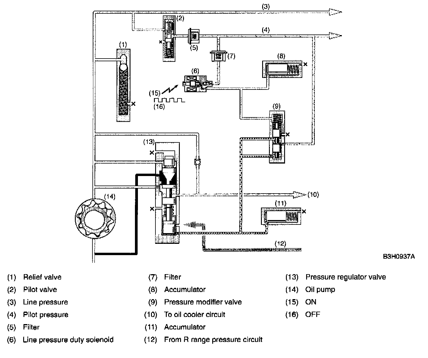 ^ The oil pump delivery pressure (line pressure) is regulated to the constant pilot pressure by the pilot valve.