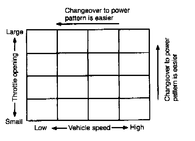 The power pattern is shifted to the base pattern, depending on car speed. Shifting to the base pattern is determined by the throttle position as shown in Figure below. Time lag in shifting is also determined by car speed. The maximum time lag is 3 seconds.
