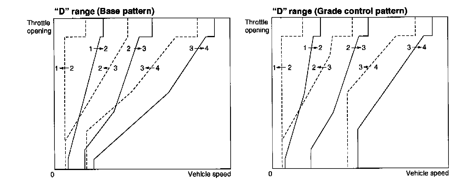 When a vehicle is descending a steep hill under the designated vehicle speed (approximately 50 miles/hour), 4th gear downshifts to 3rd gear automatically by depressing the brake pedal. This gearshift control is released by re-accelerating with depressing the accelerator pedal. These controls are doing this based on the combination of throttle opening angle, engine speed, vehicle speed and so on.