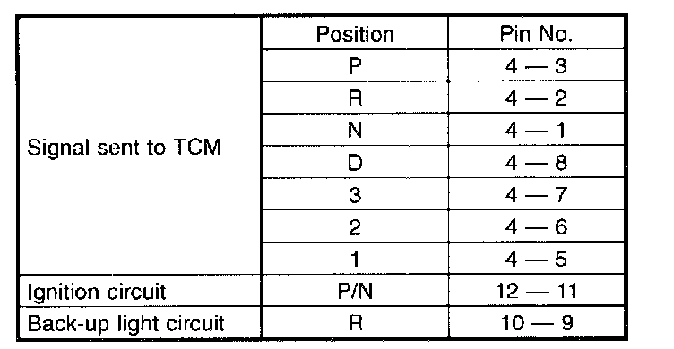 CAUTION: Also check that continuity in ignition circuit does not exist when select lever is in R, D, 3, 2 and 1 ranges.