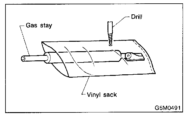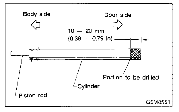 - Before discarding gas stay, place it at a slight angle with the cylinder body side facing up and drill a 2 to 3 mm (0.06 to 0.12 in) dia. hole to completely discharge the content. (Gas is odorless, colorless and harmless; however, metal powder may come out of the hole.)