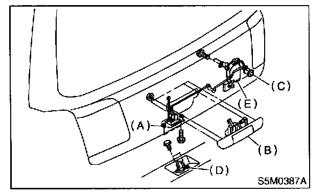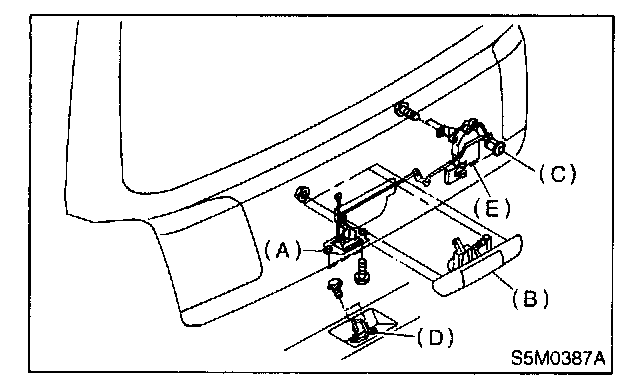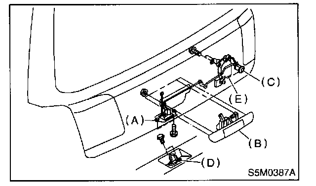 3. Remove the four nuts used to hold outer handle (B) to the inside of rear gate, and detach outer handle.