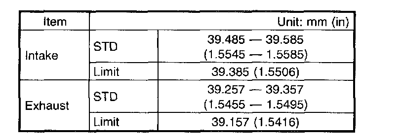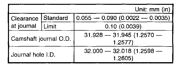 3. Measure outside diameter of camshaft journal and inside diameter of cylinder head journal, and determine the difference between the two (oil clearance). If oil clearance exceeds specifications, replace camshaft or cylinder head as necessary.