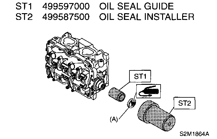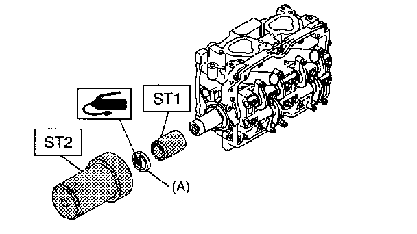 3. Apply a coat of grease to oil seal lips and install oil seal (A) on camshaft using ST1 and ST2.