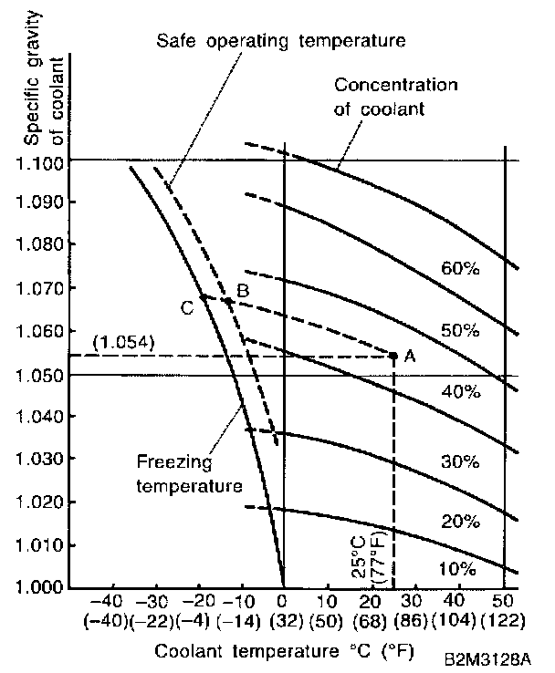 If the coolant temperature is 25°C (77°F) and its specific gravity is 1.054, the concentration is 35% (point A), the safe operating temperature is -14°C (7°F) (point B), and the freezing temperature is -20°C (-4°F) (point C).