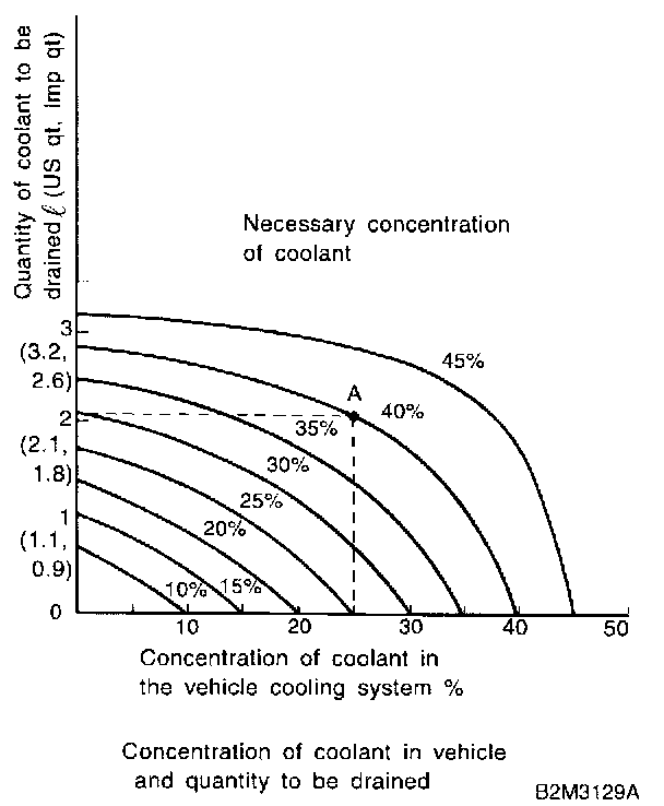 Assume that the coolant concentration must be increased form 25% to 40%. Find point A, where the 25% line of coolant concentration intersects with the 40% curve of the necessary coolant concentration, and read the scale on the vertical axis of the graph at height A. The quantity of coolant to be drained is 2.1 liters (2.2 US qt. 1.8 Imp qt.). Drain 2.1 liters (2.2 US qt. 1.8 Imp qt.) of coolant from the cooling system and add 2.1 liters (2.2 US qt. 1.8 Imp qt.) of the undiluted solution of SUBARU coolant.