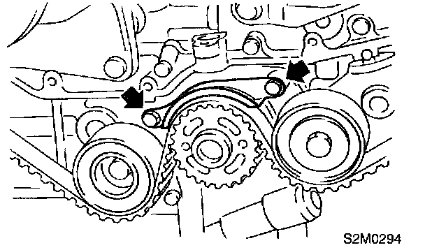 2. Using white paint, put alignment and/or arrow marks on timing belts in relation to the crank sprocket and cam sprockets.