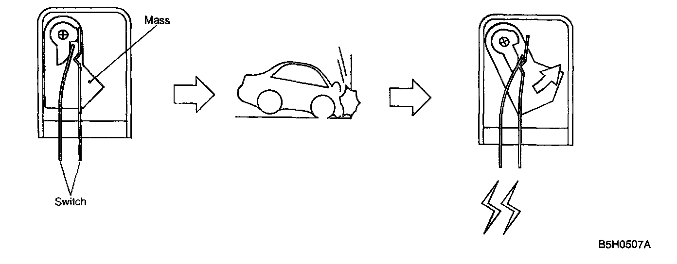Safety Sensor and electric sensor are built into the airbag control module and side airbag sensor Safety sensor is the pendulum type sensor. If the sensor receives a frontal or side impact exceeding a certain limit, the mass in the sensor moves forward to turn the switch ON.