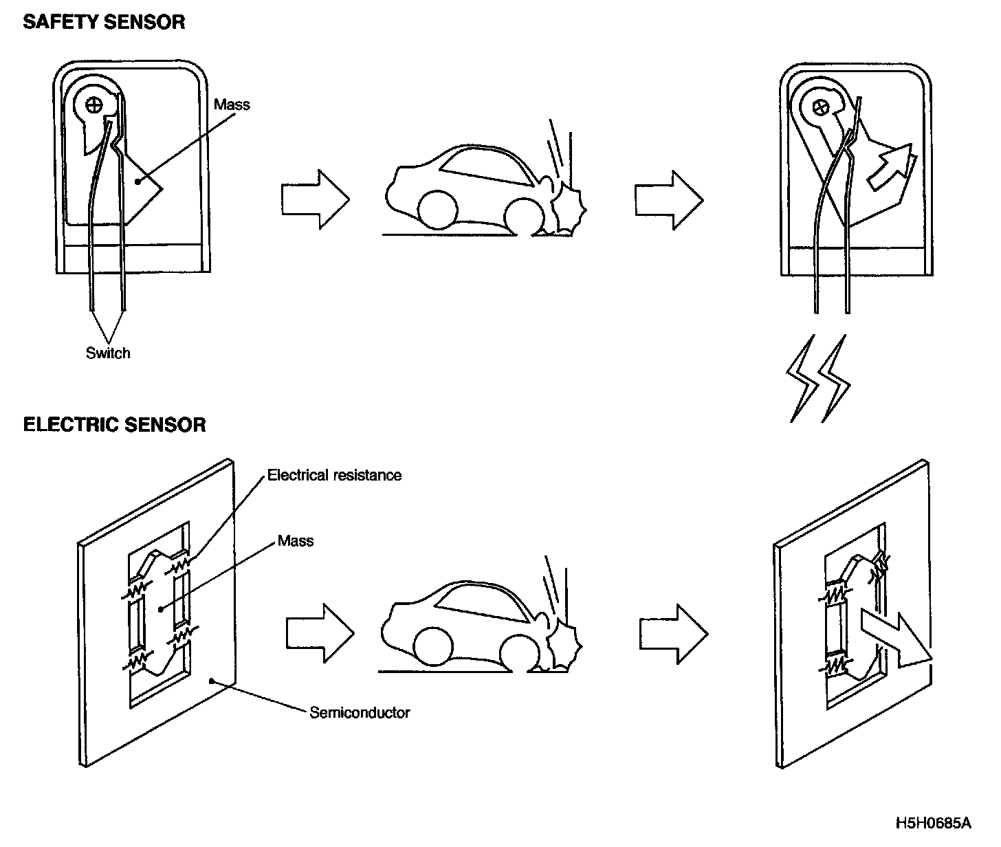 The Electric Sensor consists of the semiconductor type sensor which senses the deceleration at collision by the change of the electrical resistance and the impact sensing circuit.