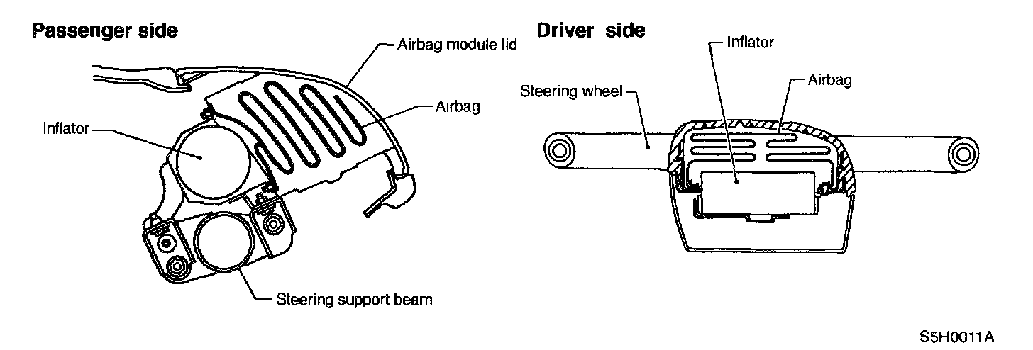 The driver's airbag module is located at the center of the steering wheel, and passenger's airbag module is located at upper side of instrument panel, and it each contains an airbag and inflator. If a collision occurs, the inflator produces a large volume of gas inflating the airbag in a very short time.