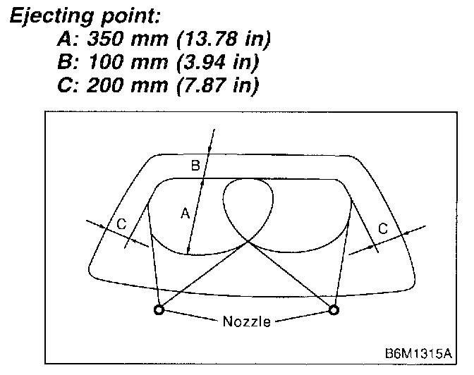 Adjust washer ejecting area on windshield glass as shown in the figure when vehicle stops.