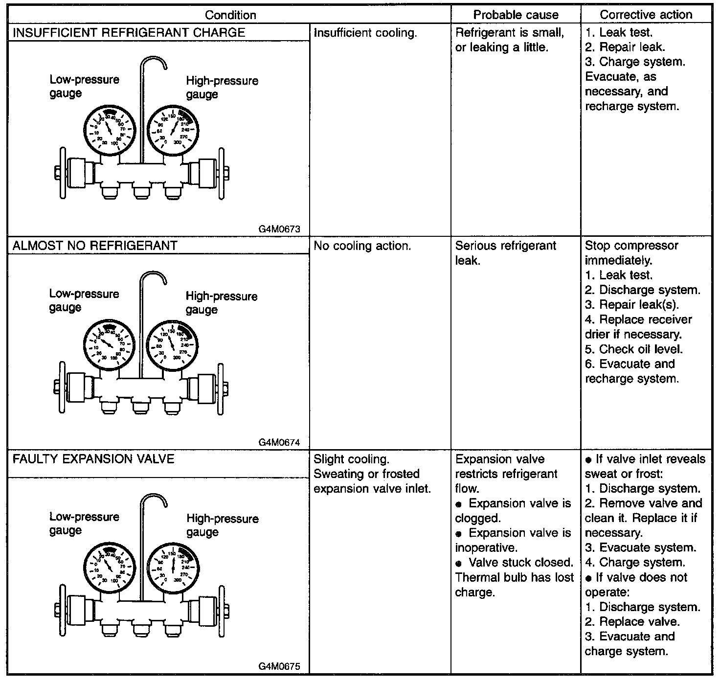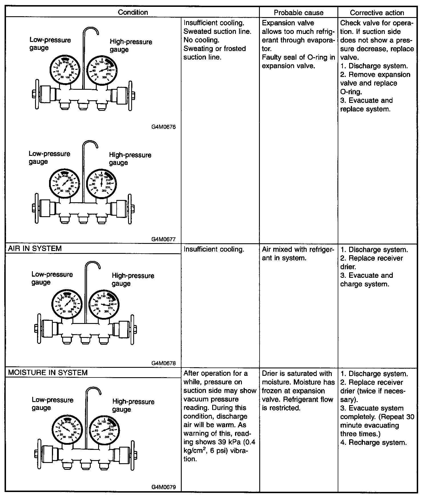 In various conditions caused to other air conditioning system, the characteristics revealed on manifold gauge reading are shown.