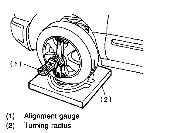 1. Place front wheel on turning radius gauge. Make sure ground contacting surfaces of front and rear wheels are set at the same height.
