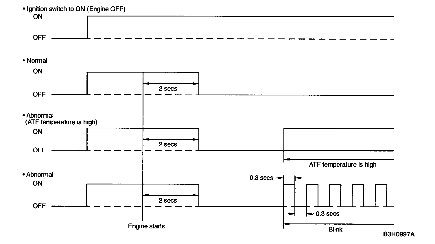 On starting the engine, AT OIL TEMP indicator light illuminates as shown below. If any trouble occurs, the light continues flashing until ignition switch is turned to ON position (engine turned off).