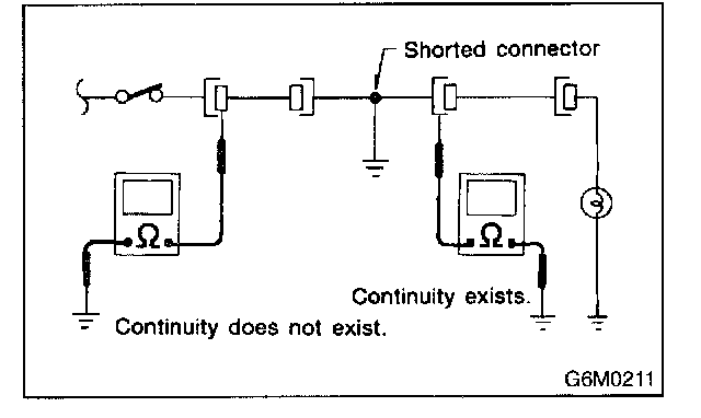 Disconnect all affected connectors, and check continuity between each connector and ground. When ohmmeter indicates continuity between a particular connector and ground, that connector is shorted.