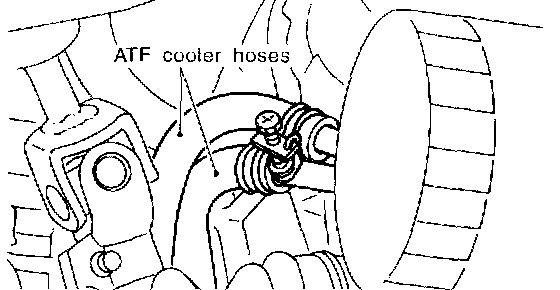 15. Disconnect ATF cooler hoses from pipes of transmission side, and remove ATF level gauge guide. (AT vehicles)