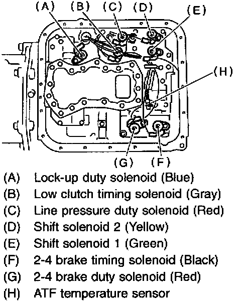 7. Disconnect the harness connectors for the solenoids, duty solenoids, ATF temperature sensor and the ground cord.