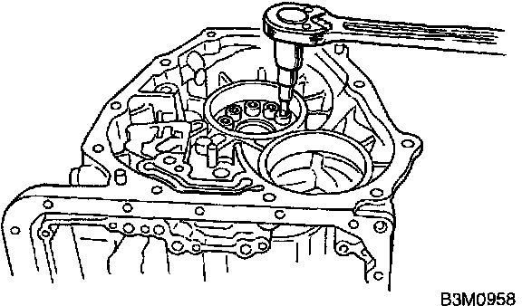 NOTE: After loosening all socket bolts, place the side of the transmission case on the floor.