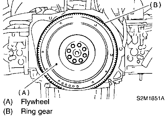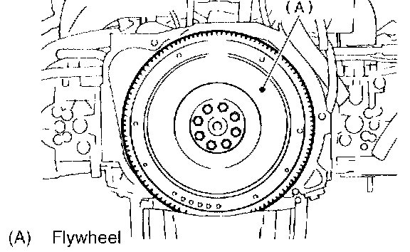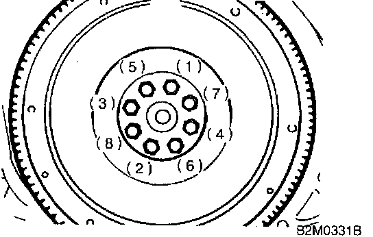 NOTE: Tighten flywheel installing bolts gradually. Each bolt should be tightened to the specified torque in a crisscross fashion.