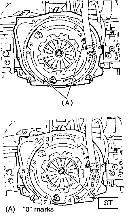 ^ When installing the clutch cover on the flywheel, position the clutch cover so that there is a gap of 120° or more between "0" marks on the flywheel and clutch cover. ("0" marks indicate the directions of residual unbalance.)