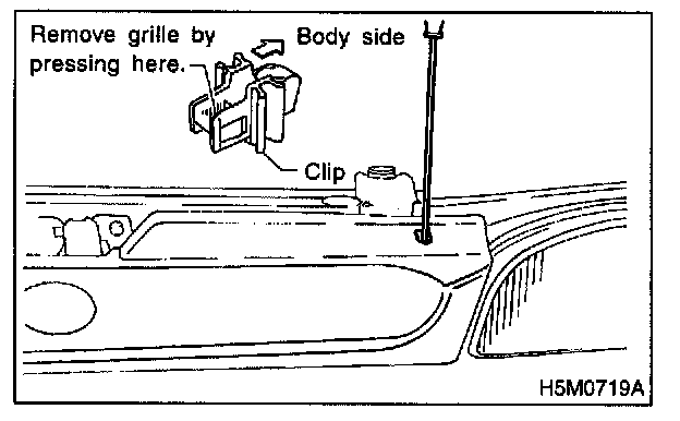 Remove two upper clips from body panel. To facilitate removal, press portion shown in figure using screwdriver while lightly pulling front grille.