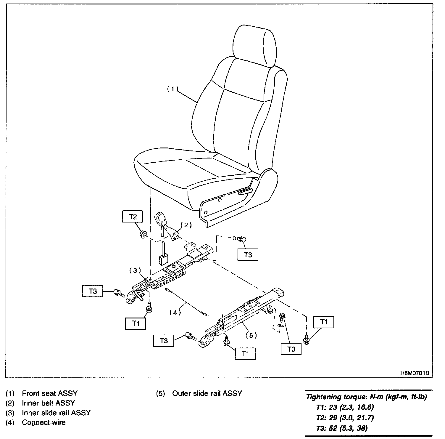 4. Secure the front of seat using inward and outward bolts (A) and (B) in that order.
