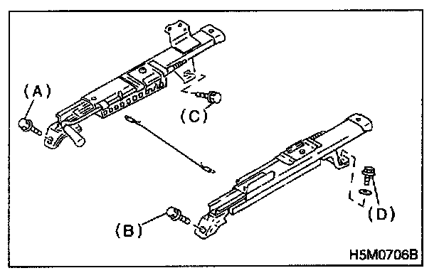 9. If any mechanism does not function properly, loosen bolts (C) and (D), slide seat as required, insert all lock plate pawls into holes in slide rail brackets, and tighten bolts (C) and (D) in that order.
