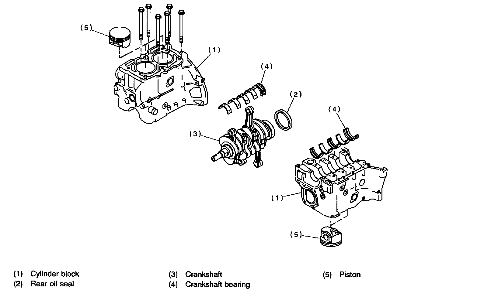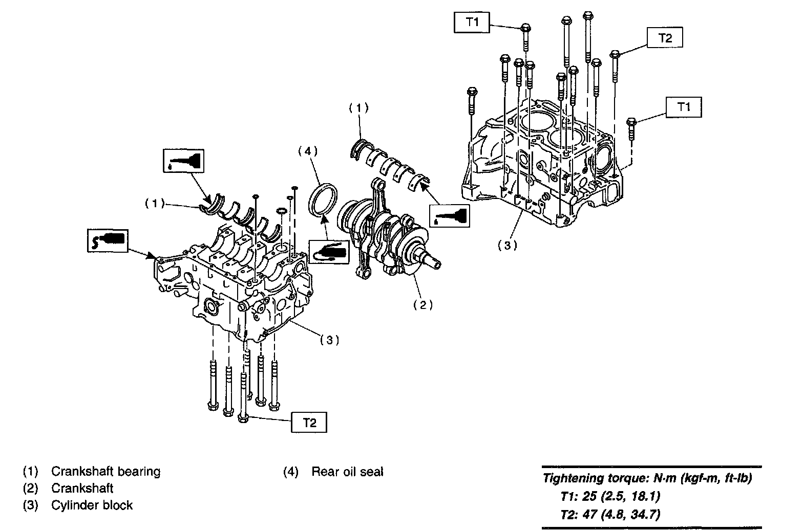 CAUTION: Remove oil in the mating surface of bearing and cylinder block before installation. Also apply a coat of engine oil to crankshaft pins.