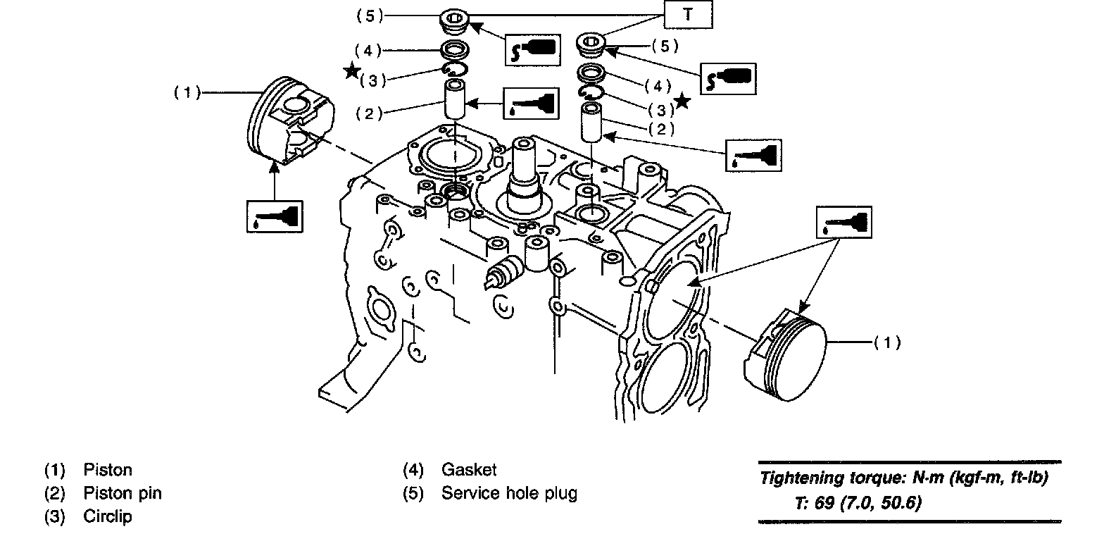 b. Apply a coat of engine oil to piston pin and insert piston pin into piston and connecting rod through service hole.