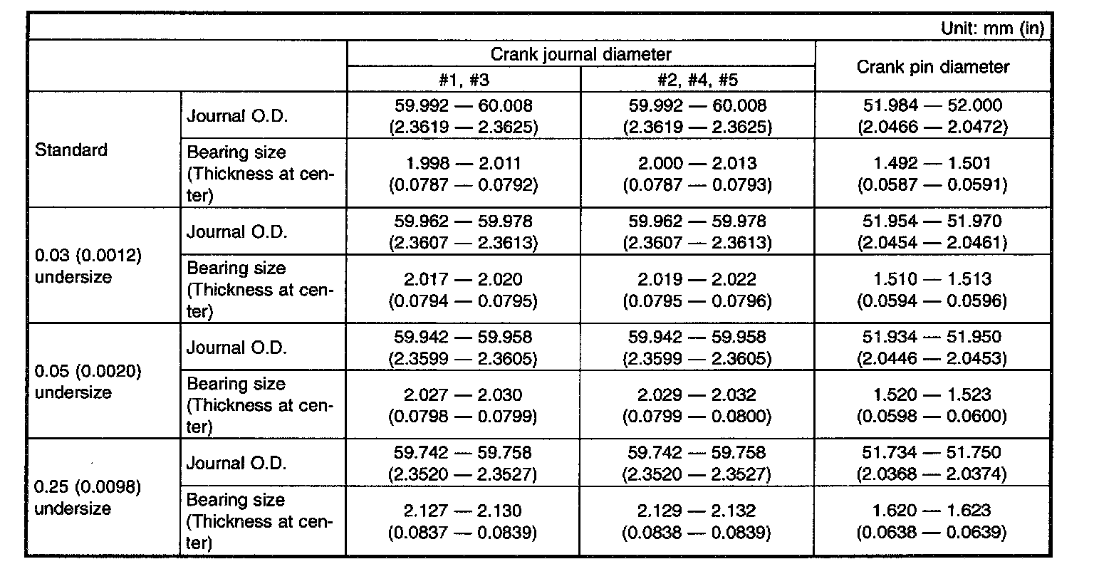 3. Inspect the crank journal and crank pin for wear. If they are not within the specifications, replace bearing with a suitable (undersize) one, and replace or recondition crankshaft as necessary. When grinding crank journal or crank pin, finish them to the specified dimensions according to the undersize bearing to be used.