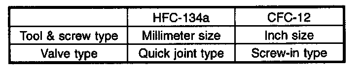 CAUTION: When working on vehicles with the HFC-134a system, only use HFC-134a specified tools and parts. Do not mix with CFC-12 tools and parts. If HFC-134a and CFC-12 refrigerant or compressor oil is mixed, poor lubrication will result and the compressor itself may be destroyed. In order to help prevent mixing HFC-134a and CFC-12 parts and liquid, the tool and screw type and the type of service valves used are different The gas leak detectors for the HFC- 134a and CFC-12 systems must also not be interchanged.