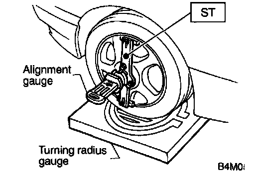 2. While depressing brake pedal, turn steering wheel fully to the left and right. With steering wheel held at each fully turned position, measure both the inner and outer wheel steering angle.
