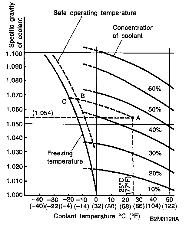 If the coolant temperature is 25°C (77°F) and its specific gravity is 1.054, the concentration is 35% (point A), the safe operating temperature is -14°C (7°F) (point B), and the freezing temperature is -20°C (-4°F) (point C).