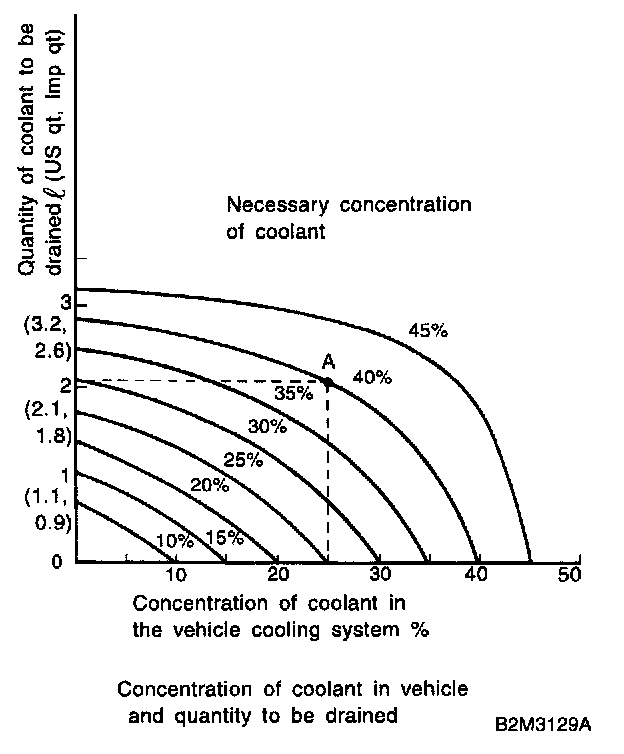 Assume that the coolant concentration must be increased form 25% to 40%. Find point A, where the 25% line of coolant concentration intersects with the 40% curve of the necessary coolant concentration, and read the scale on the vertical axis of the graph at height A. The quantity of coolant to be drained is 2.1 liters (2.2 US qt. 1.8 Imp qt). Drain 2.1 liters (2.2 US qt. 1.8 Imp qt) of coolant from the cooling system and add 2.1 liters (2.2 US qt. 1.8 Imp qt) of the undiluted solution of SUBARU coolant.