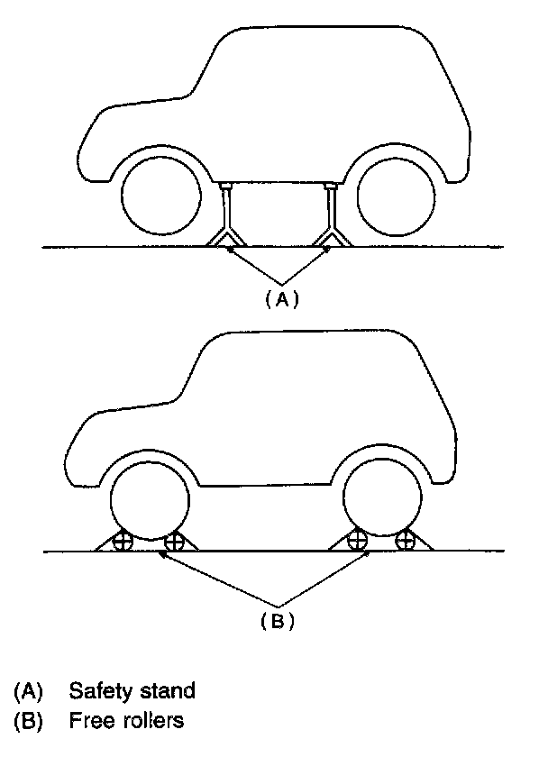 ^ In order to prevent the vehicle from slipping due to vibration, do not place any wooden blocks or similar items between the safety stands and the vehicle.