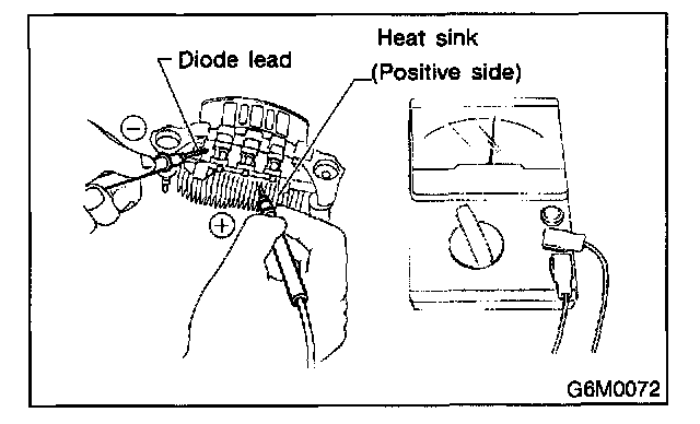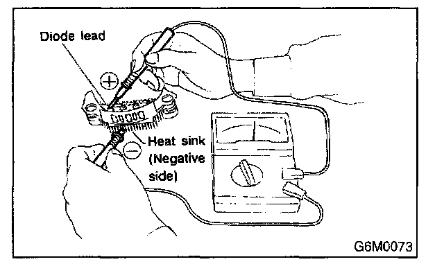 Check for continuity between the diode lead and the positive side heat sink. The positive diode is in good condition if continuity exists only in the direction from the diode lead to the heat sink.