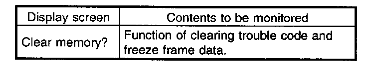 - If freeze frame data is not properly stored in memory (due to a drop in ABSCM power supply, etc.), a freeze frame data, preceded by a question mark "?", appears on the select monitor display. This shows it may be an unreliable reading. The value of the freeze frame data will be written over, and the memory cannot be cleared.
