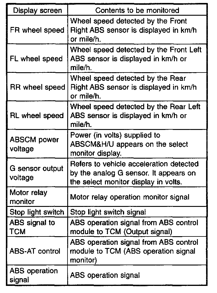 - If a particular trouble code is not properly stored in memory (due to a drop in ABSCM & H/U power supply, etc.) when a problem occurs, the trouble code, followed by a question mark "?", appears on the select monitor display. This shows it may be an unreliable reading.