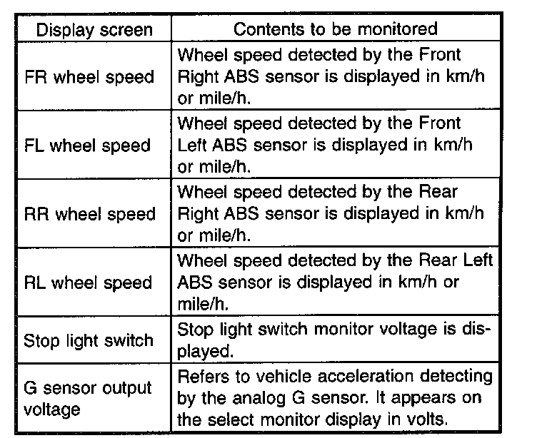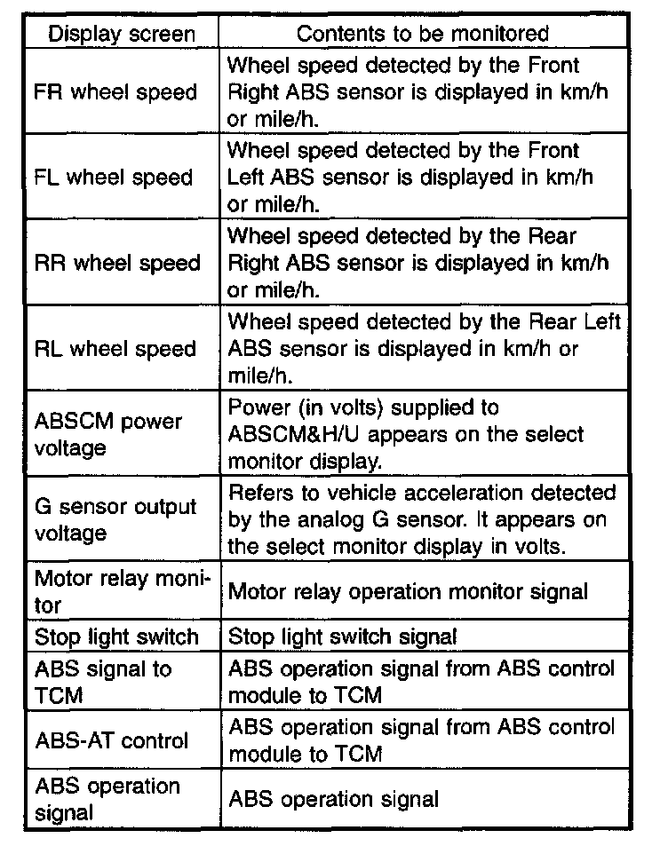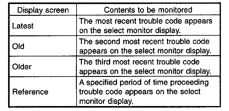- If a particular trouble code is not properly stored in memory (due to a drop in ABSCM&H/U power supply, etc.) when a problem occurs, the trouble code, followed by a question mark "?", appears on the select monitor display. This shows it may be an unreliable reading.