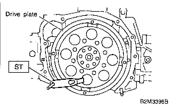 16. Remove flywheel (MT vehicles only) or drive plate (AT vehicles only).