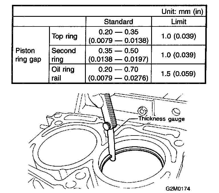 2. Squarely place piston ring and oil ring in cylinder, and measure the piston ring gap with a thickness gauge.
