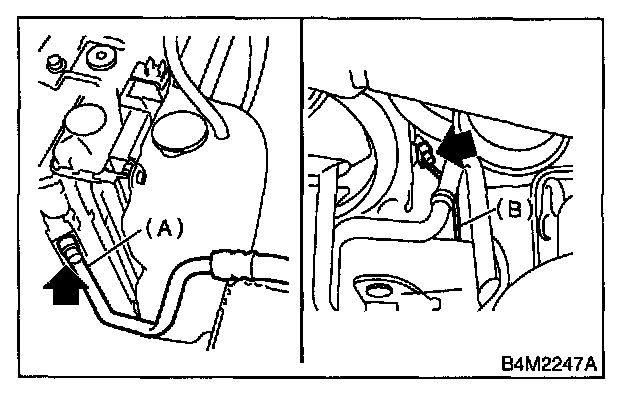 4. Disconnect high-pressure hose (A) and low- pressure hose (B) from condenser.