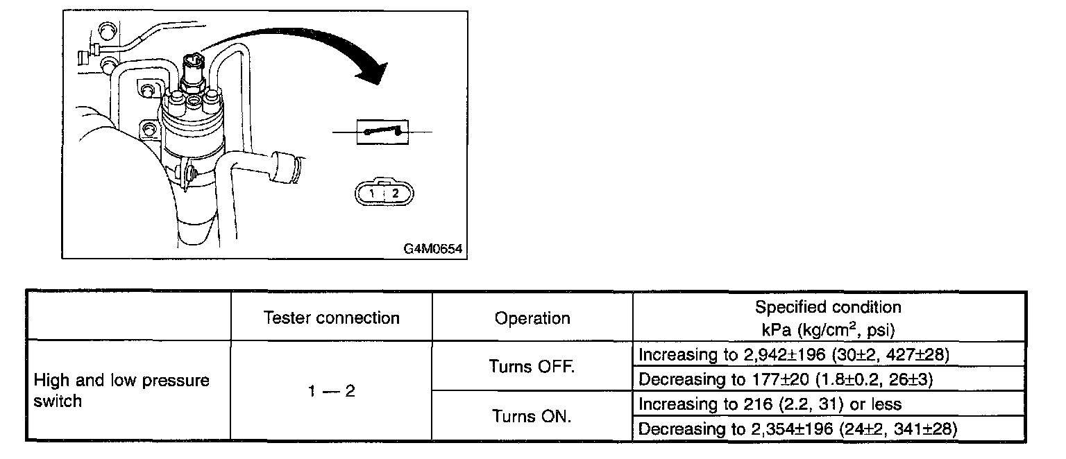 2. Remove the pressure switch harness connector. Using a circuit tester, inspect the ON-OFF operation of the pressure switch.